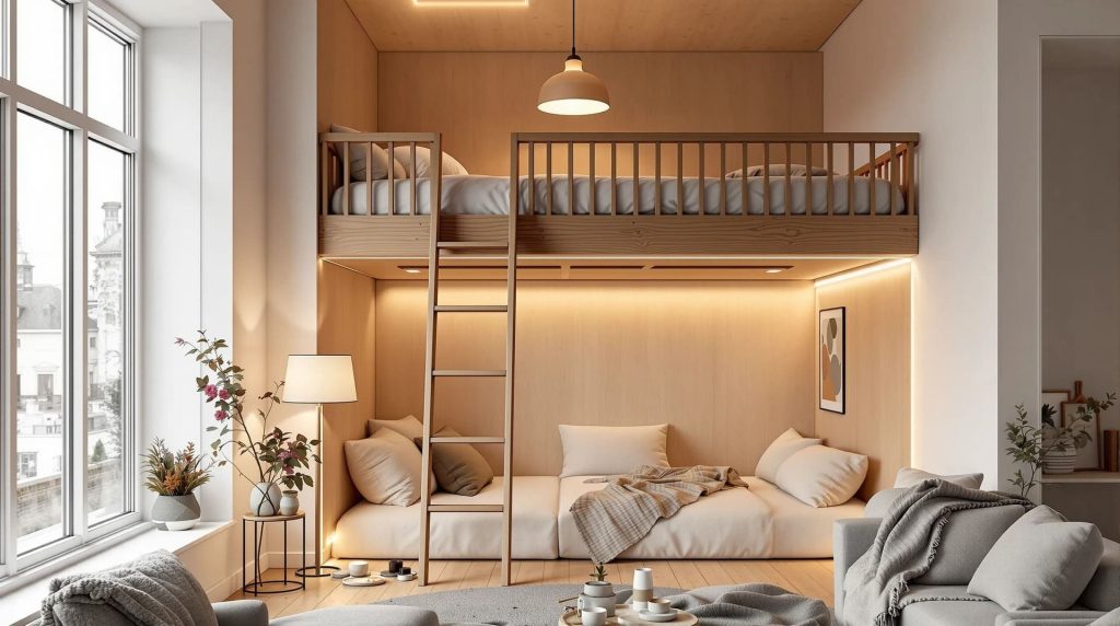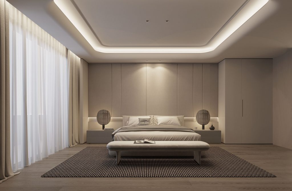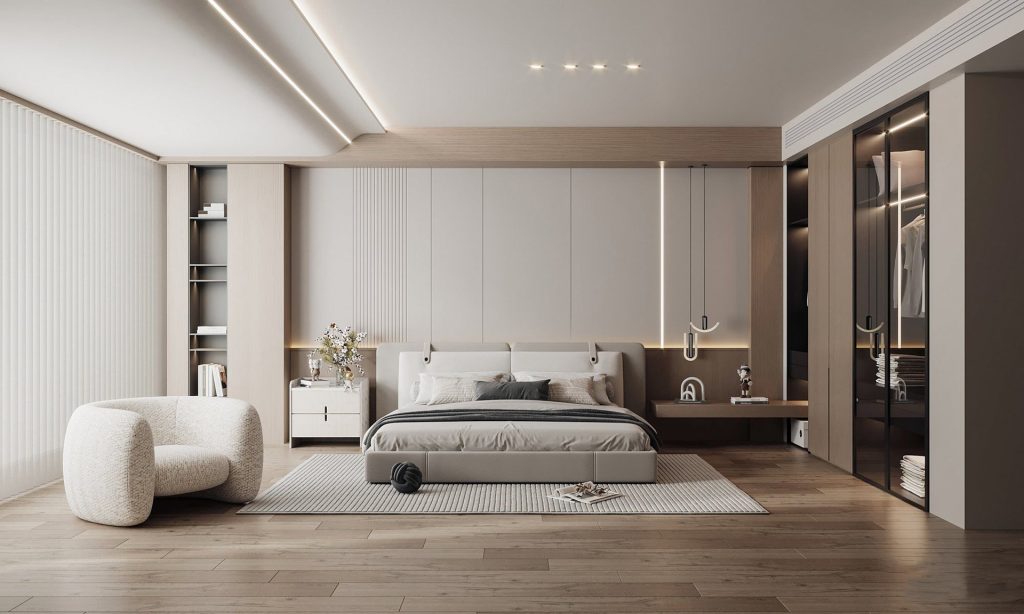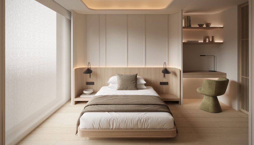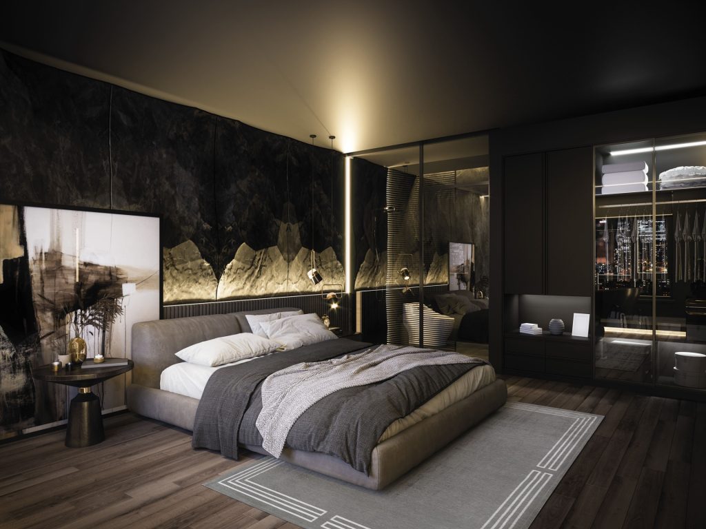 A unique designer project for an Italian-style bathroom interior. It combines pleasant tones, stone textures, beautiful wooden elements, and a distinctive lighting design. Ample greenery adds a special touch to the overall atmosphere.